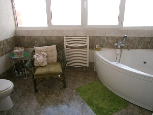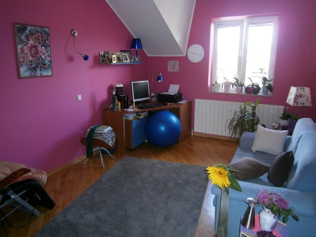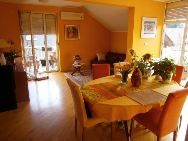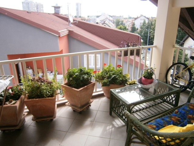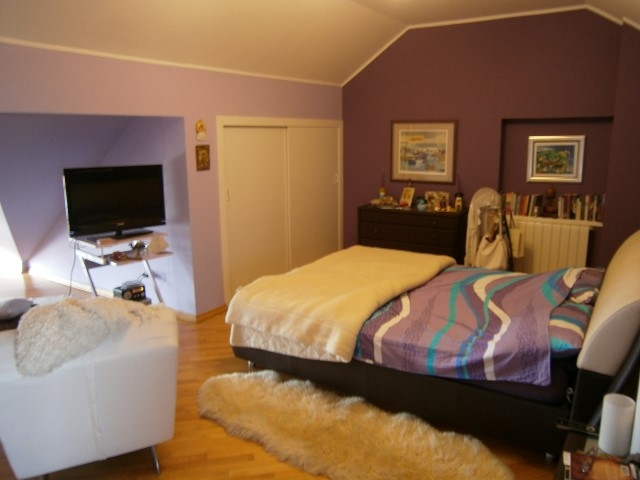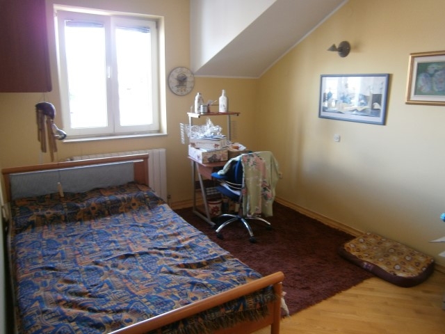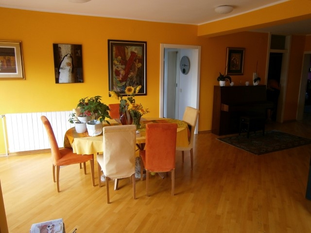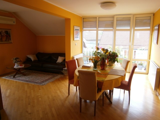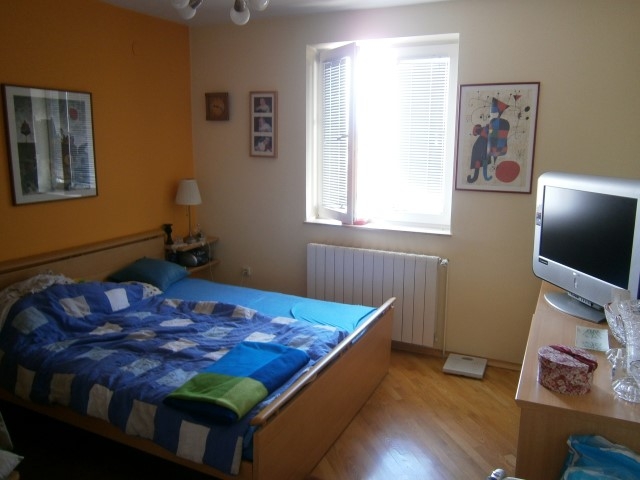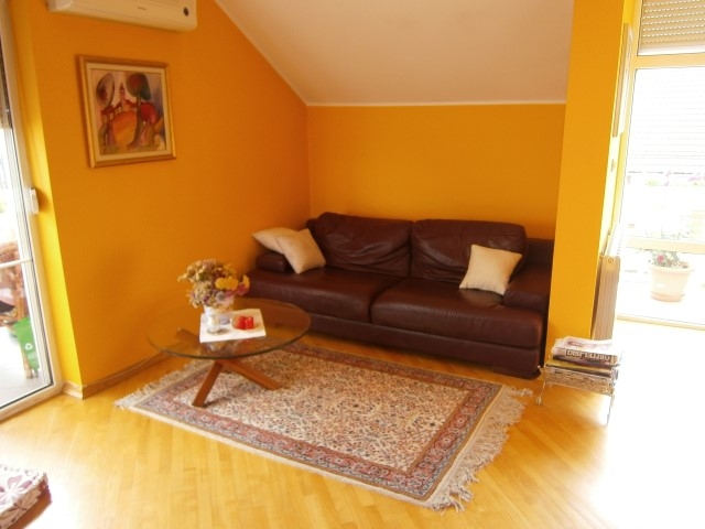 Dvoetažni 5-sobni stan (180m2) za najam u novijoj kući sa ukupno 3 stana. Na donjoj etaži stana smješten je ulazni prostor, kuhinja, dnevni boravak s blagovaonom, balkon, 2 spavaće sobe, kupaona (tuš), ostava i gostinjski WC. Na gornoj etaži stana nalazi se glavna spavaća soba s kupaonom (kada), velika garderoba i balkon. Stanu pripadaju 2 vanjska parkirna mjesta.