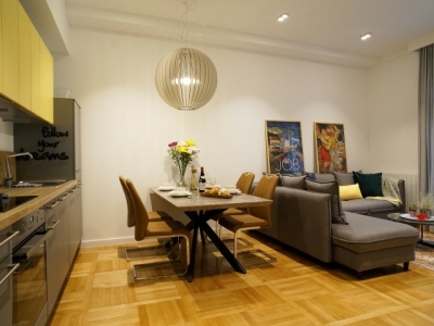 The apartment consists of: living room, dining room and kitchen with open floor plan, bedroom, bathroom and balcony. Air conditioned, gas central heating. Orientation to the west.