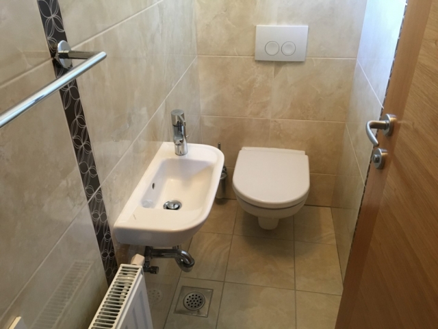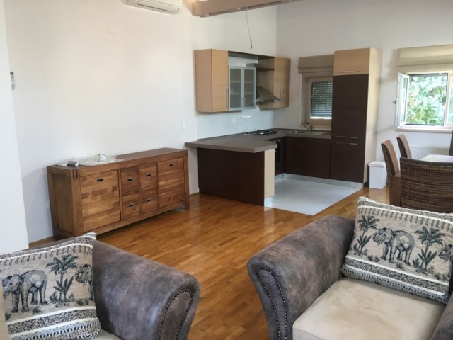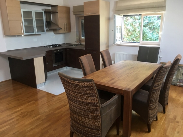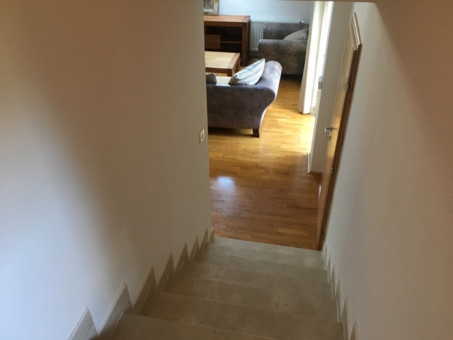 The apartment consists of a spacious living room with kitchen and dining room in open-space, balcony, garden terrace and guest toilet. The living part of the apartment is connected to the sleeping part by an inner staircase leading to the upper floor where two bedrooms are located and a bathroom with tub.