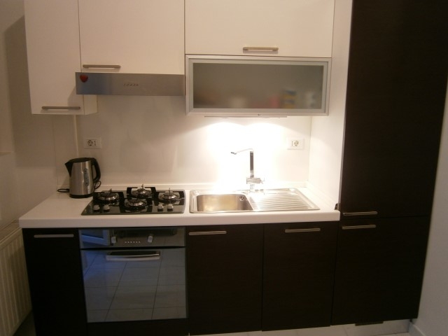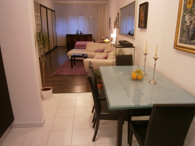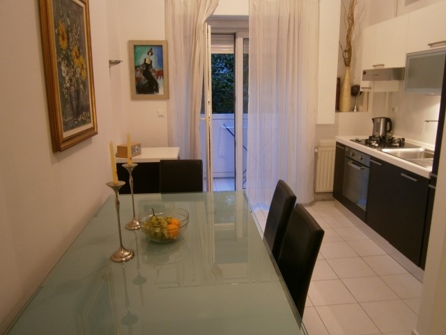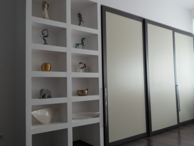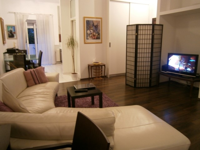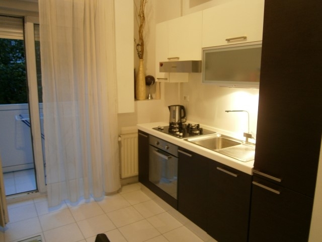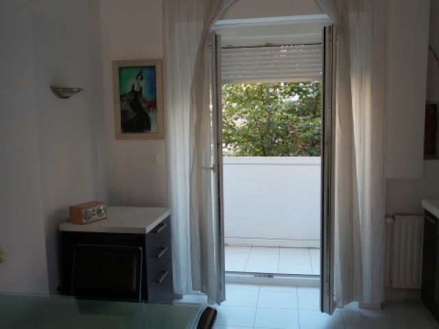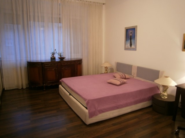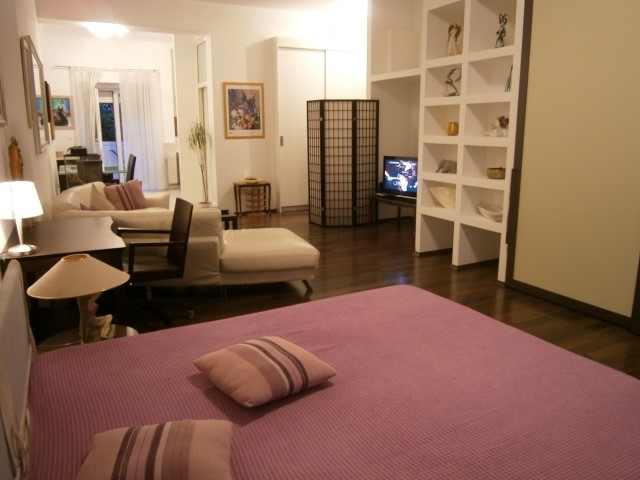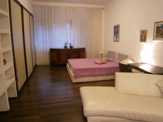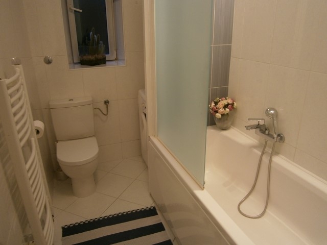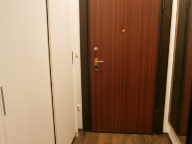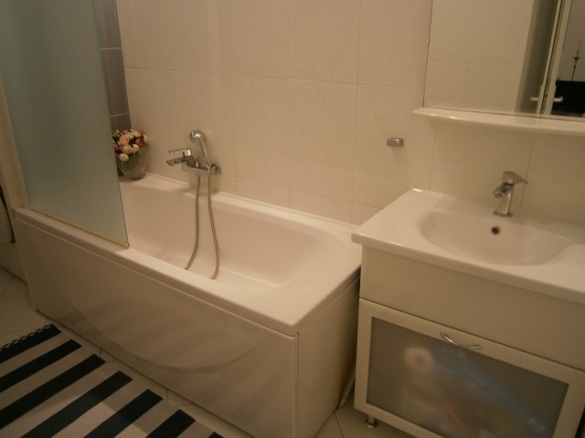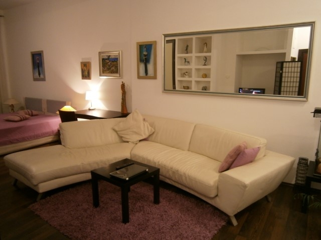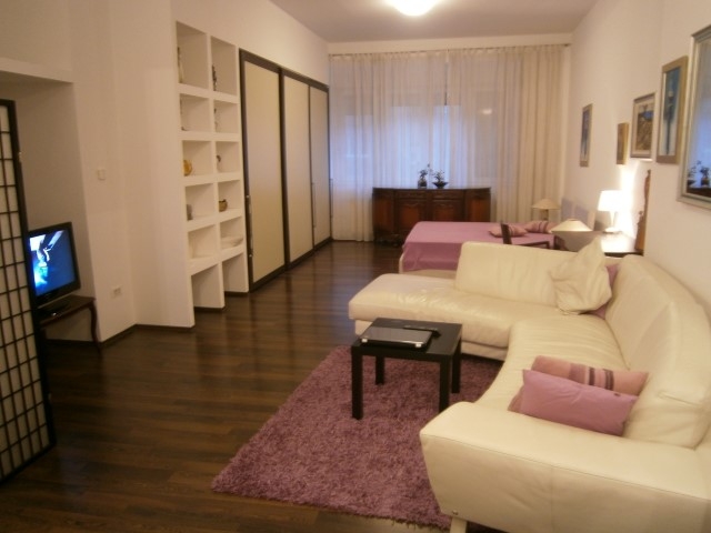 Modern open-space flat in the wider center of the city. The flat is designer decorated. It is located on the 2nd floor of a neatly maintained residential building. It consists of a large room of 45m2 which consists of an entrance hall with built-in wardrobe, a large designer sofa, desk, double bed and large built-in wardrobe. In addition there is a bathroom with bath tub and toilet and a kitchen with a dining table and a small Loggia.