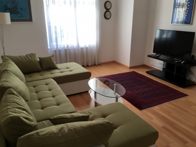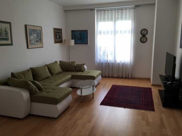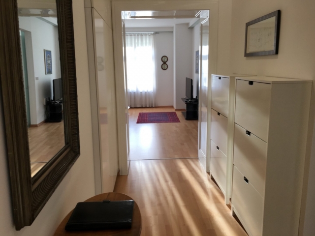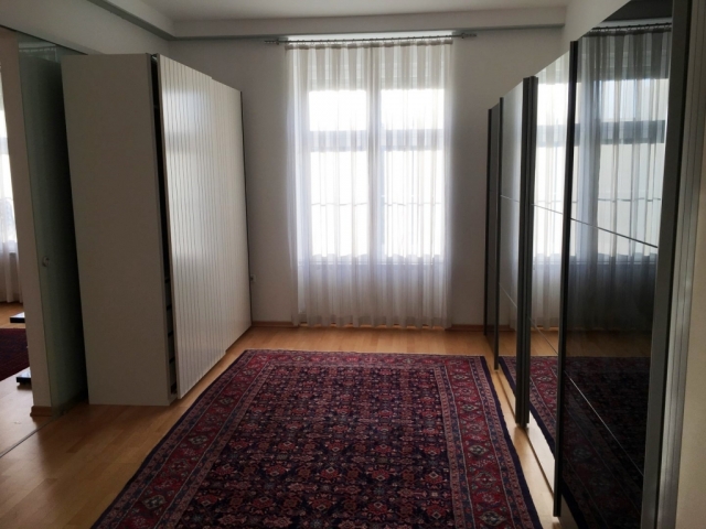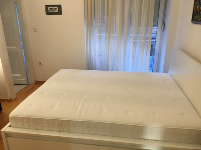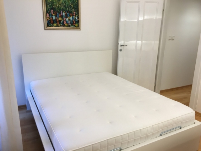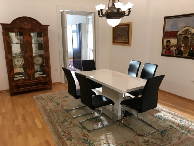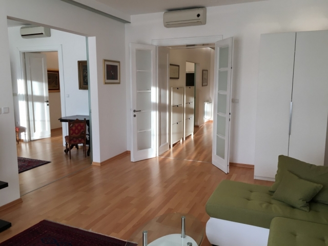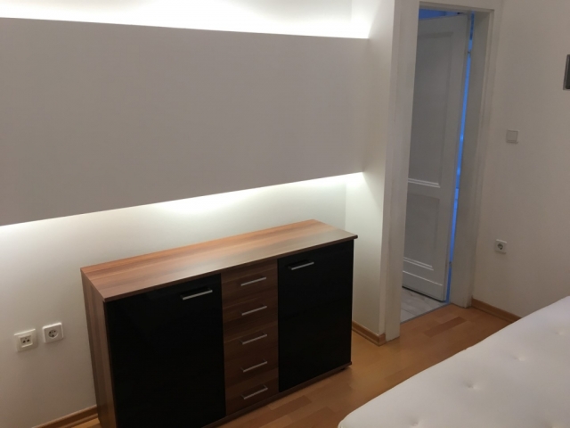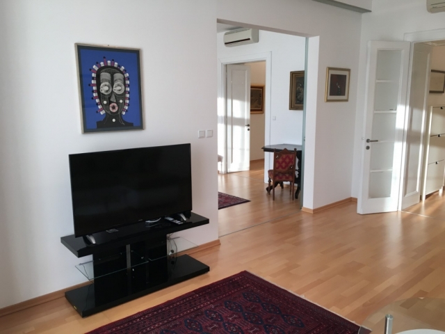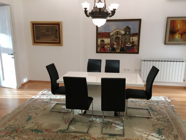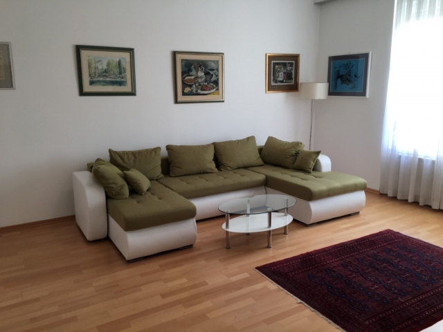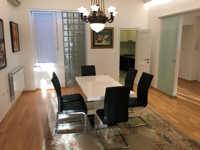 Iznajmljuje se potpuno renovirani trosobni stan na Mažuranićevom trgu. Stan je smješten na 2. katu uredno održavane zgrade s liftom. Sastoji se od dnevnog boravka, hodnika, blagovaone, kuhinje, dvije spavaće sobe, dvije kupaone i balkona. Opremljen je svim aparatima, klimom, ugrađenim ormarima, modernom rasvjetom.