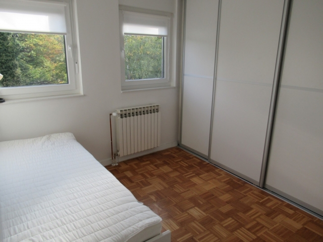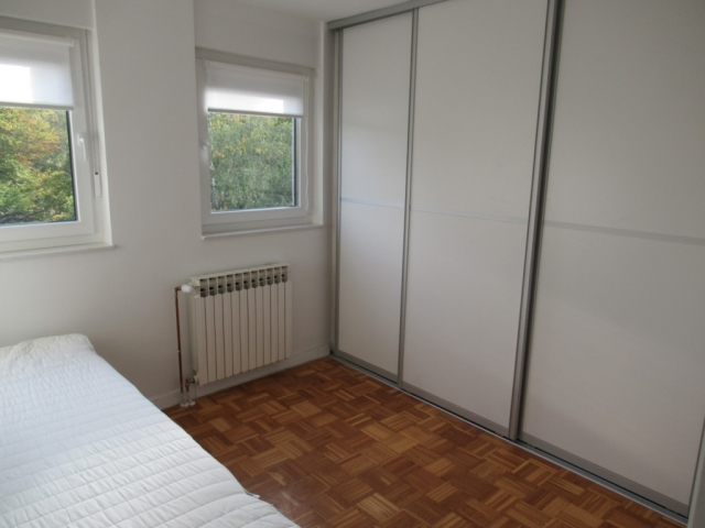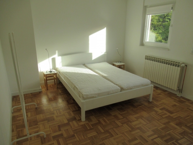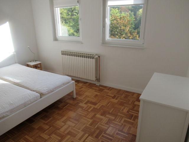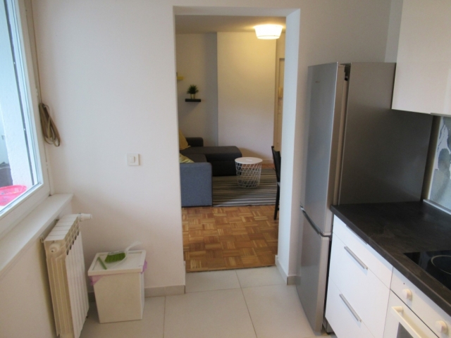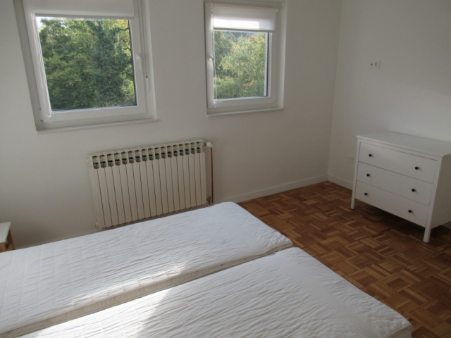 Iznajmljuje se novo uređeni trosobni stan na 5. katu stambene zgrade bez lifta. Stan se sastoji od ulaznog pretprostora s garderobom, dnevne sobe s prostorom za blagovanje, kuhinje, zatvorene loggije, 2 spavaće sobe i kupaonice.